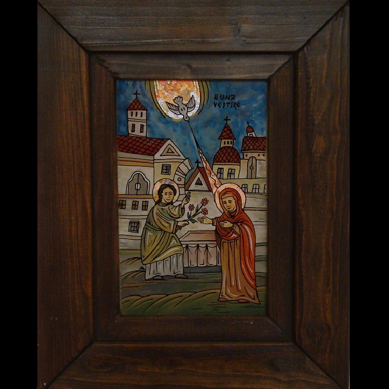 - Icoana este pictata pe sticla, executata in tehnica tempera cu emulsie de ou si ulei, avand la baza un model traditional romanesc.